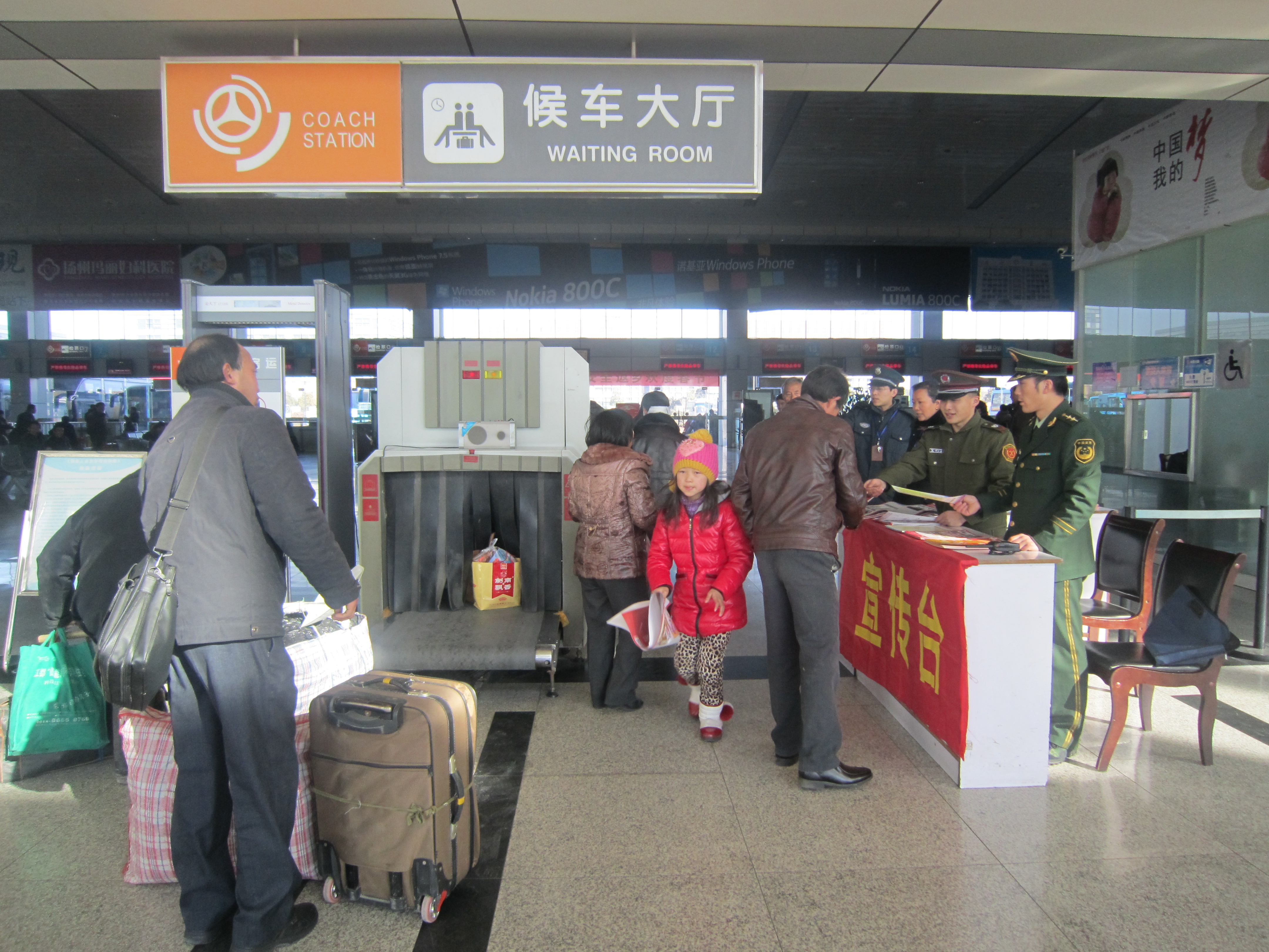 危險品檢查儀旁,紅色的安全宣傳臺引人注目,武警揚州消防支隊的幾名官兵和車站員工一起向接受危險品檢查的旅客熱情發(fā)放宣傳畫,并提醒在返鄉(xiāng)旅程中應該注意的安全事項。幾名女官兵還走進候車廳發(fā)放,講解遇有緊急情況時的急救逃生知識。不少旅客在候車過程中,認真看著宣傳畫,還不時交流,一旁的官兵不時接受旅客的咨詢,解答他們的問詢。