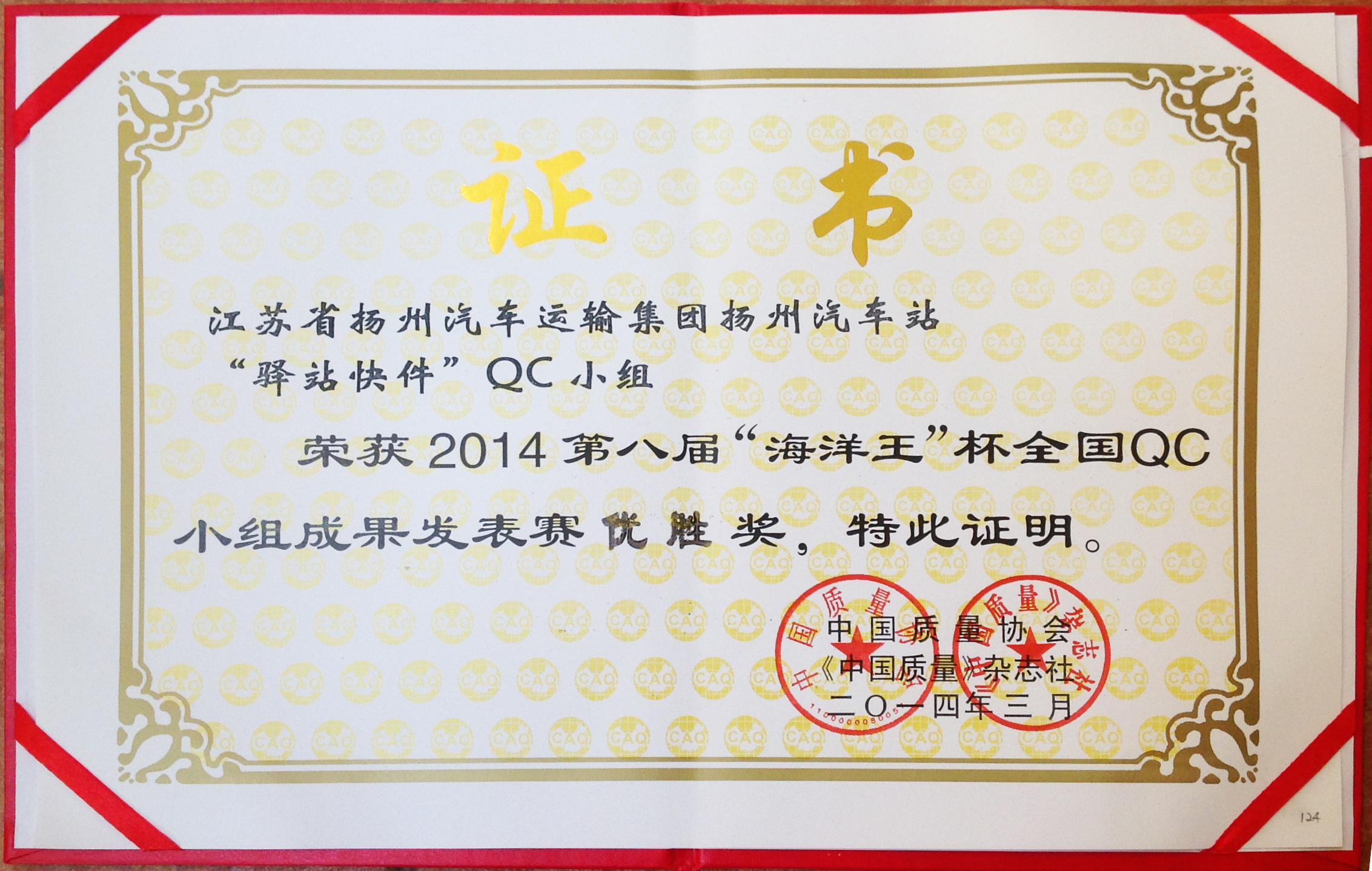 “海洋王”杯QC小組發(fā)表賽是一項全國性比賽,今年共有300多個成果報名,經(jīng)過層層選拔,來自全國各地QC小組代表500余人,197個成果參加現(xiàn)場發(fā)布。經(jīng)過5天緊張的成果發(fā)布,我司揚州汽車站“驛站快件”QC小組成員余妍、潘潔發(fā)表的《降低到達庫收發(fā)貨的誤差率》在激烈的角逐中脫穎而出,獲得第八屆“海洋王”杯最高榮譽——優(yōu)勝獎,和其他47個成果一起被直接推薦為2014年度全國優(yōu)秀QC小組。