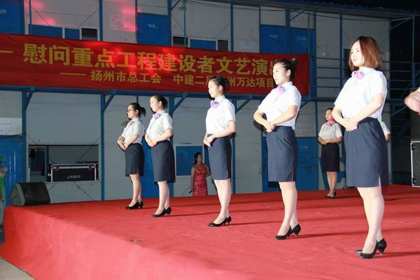 5月3日晚,由揚(yáng)州市總工會(huì)主辦、揚(yáng)州市建設(shè)產(chǎn)業(yè)工會(huì)承辦的“建設(shè)者之歌”——慰問(wèn)重點(diǎn)工程建設(shè)者文藝演出,在揚(yáng)州萬(wàn)達(dá)廣場(chǎng)項(xiàng)目部生活區(qū)隆重舉行。我公司參演的《七彩揚(yáng)汽——員工行為規(guī)范操》得到了在場(chǎng)領(lǐng)導(dǎo)和工程建設(shè)者的一致好評(píng)。市總工會(huì)副主席洪慧娟,市建設(shè)產(chǎn)業(yè)工會(huì)主任田繼榮,市交通產(chǎn)業(yè)集團(tuán)黨委副書記、紀(jì)委書記、工會(huì)主席王寧生等領(lǐng)導(dǎo)出席了晚會(huì)。