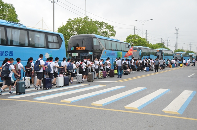 江蘇揚汽集團(tuán)承擔(dān)了此次新生運輸任務(wù),由旅游出租分公司牽頭,抽調(diào)快客、快鹿等各有車單位的大客車38輛,運送樹人中學(xué)師生近2000人。