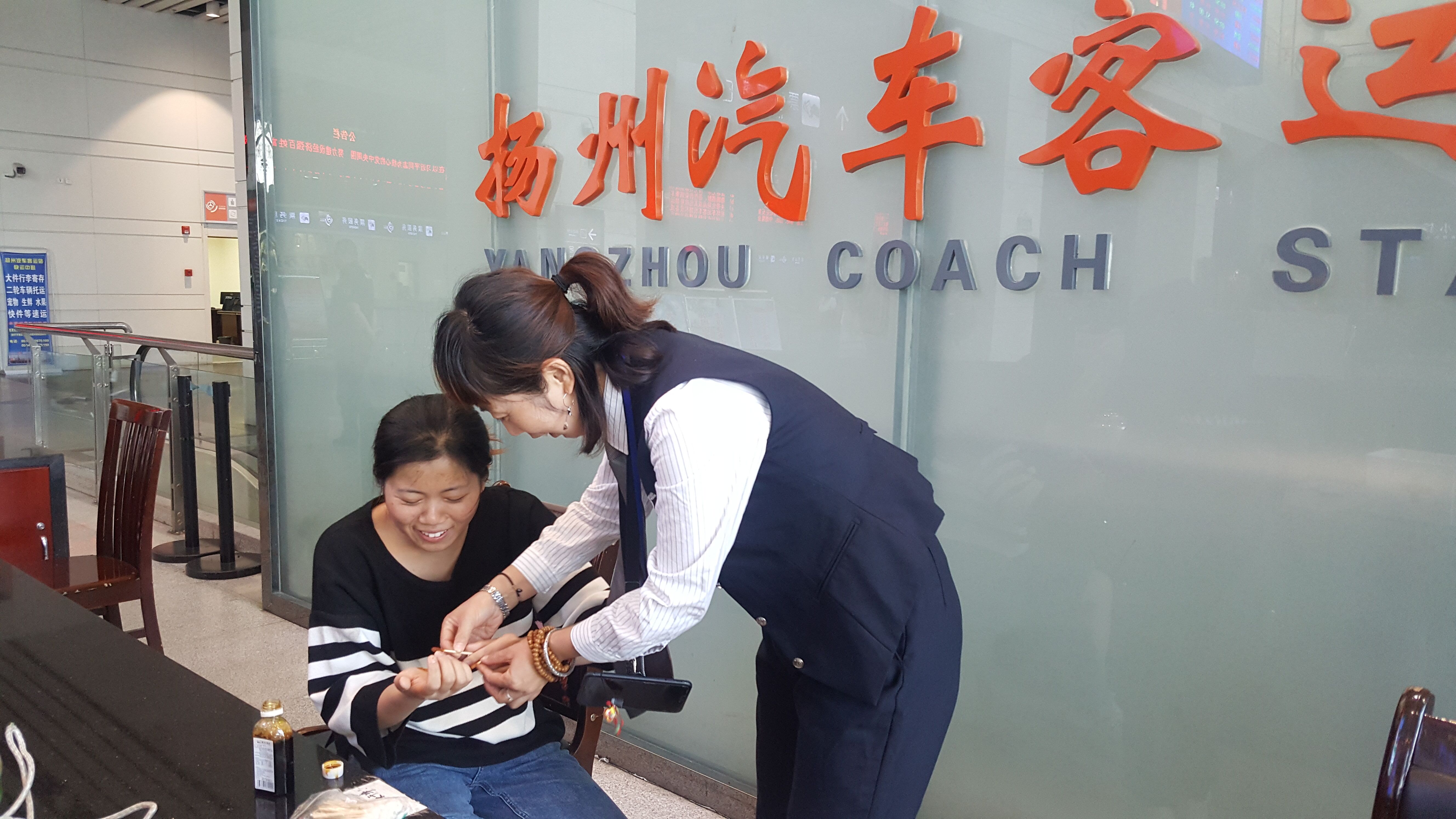 今天(10月11日)下午3時許,揚州西部客運樞紐售票大廳門口,一位年輕女子背著行李,一瘸一拐痛苦地邁進了汽車站售票大廳,見此情形,眼尖心細的服務班工作人員殷俊,迅速跑上前去,攙扶著該女士坐下。