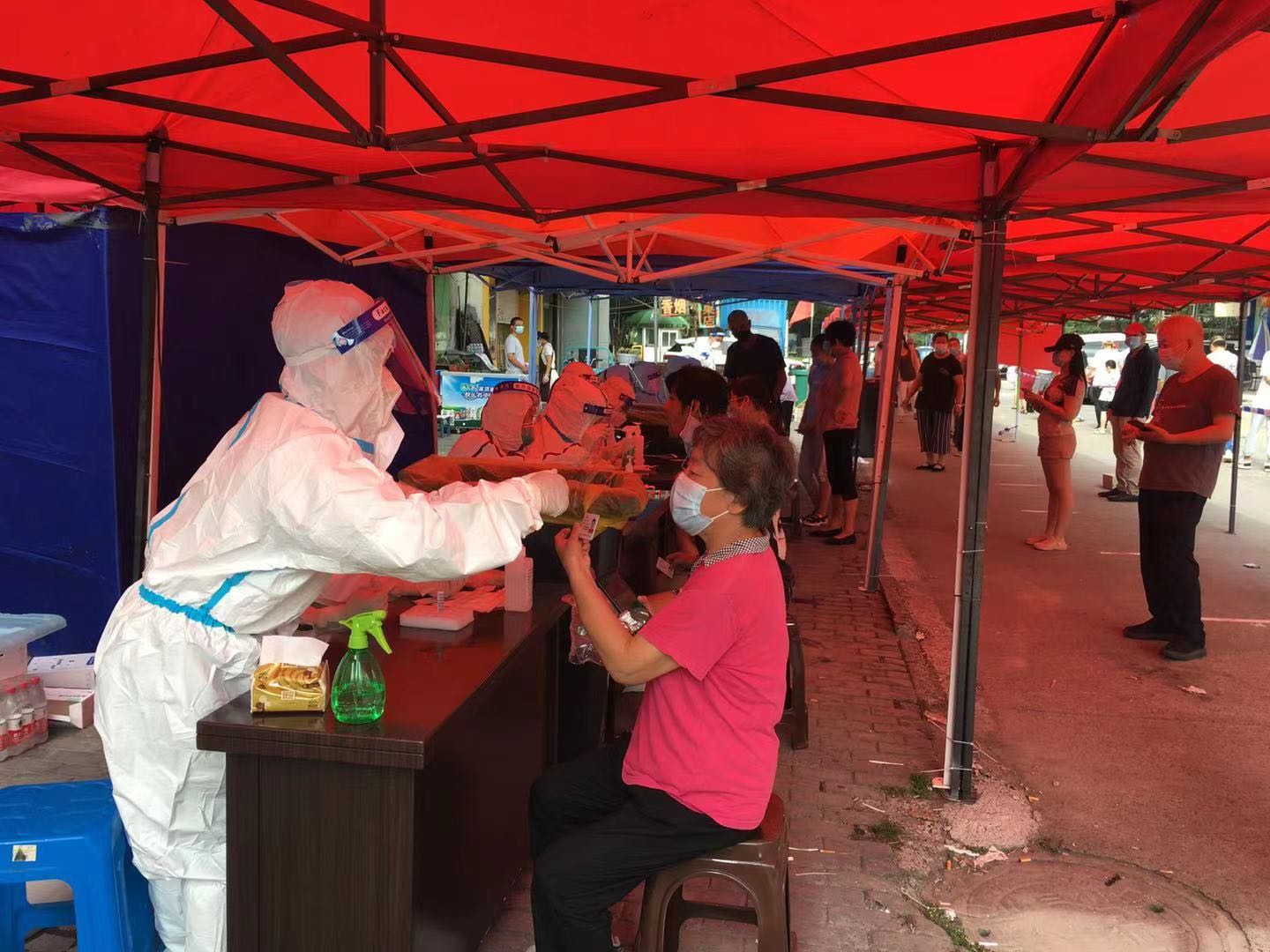 隨著時間的推延,戶外炎熱難耐,不是親身經(jīng)歷,真難以想象沖在第一線的醫(yī)護人員是怎么熬過來的。為時近幾個小時的這段艱難時光中,我好幾次覺得自己快缺氧窒息了,不過看著其他志愿者送來的降溫冰塊,給我們?nèi)韲姙⒕凭禍,誰又何嘗不是負重前行呢?在一次次鼓勵加油中,終于完成了上午的核酸檢測任務,當我脫下防護服后,衣服可以擠出水來,雙手被汗?jié)n泡的發(fā)白。同時,排隊做核酸的居民也很辛苦,個個汗流浹背,他們聽從指揮,秩序井然,有的向我們問候,“你們也辛苦了!”,心里很是感動。